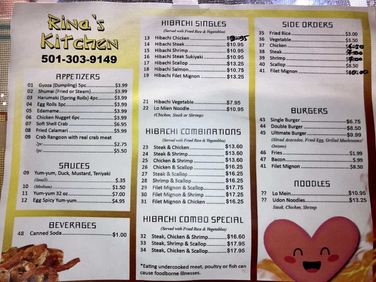 Rina's Hibachi Kitchen offers a diverse and enticing menu, perfect for those craving flavorful hibachi dishes or delicious appetizers. Starting with the appetizers, you can enjoy Gyoza (Dumpling) - 5 pieces, Harumaki (Spring Rolls) - 4 pieces, or Egg Rolls - 3 pieces, alongside lighter options like Edamame or Chicken Nuggets - 6 pieces. For those who love dipping sauces, the restaurant provides a variety of flavorful choices, including Yum-Yum, Duck, Mustard, and Teriyaki in small and medium sizes, as well as the unique Egg Spicy Yum-Yum.